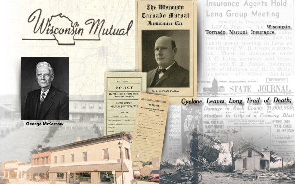Founded in 1903, Wisconsin Mutual Insurance Company began as Wisconsin Tornado Mutual Insurance Company, organized in Evansville, Wisconsin, with leadership operating from their own homes. In 1928, the office moved to Milton Junction with W.A. McEwan as president and George McKerrow as secretary.